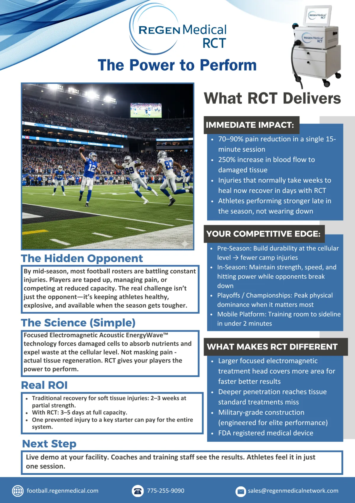 Elite football programs are turning to Regenerative Cellular Technology (RCT) for one reason: it keeps players at peak performance – accelerating recovery, fortifying tissue resilience, and minimizing downtime. It's a cutting-edge, non-invasive therapy that uses Focused Electromagnetic Acoustic EnergyWave™ to supercharge the body's own healing so your players spend more time on the field and less time in the training room.
